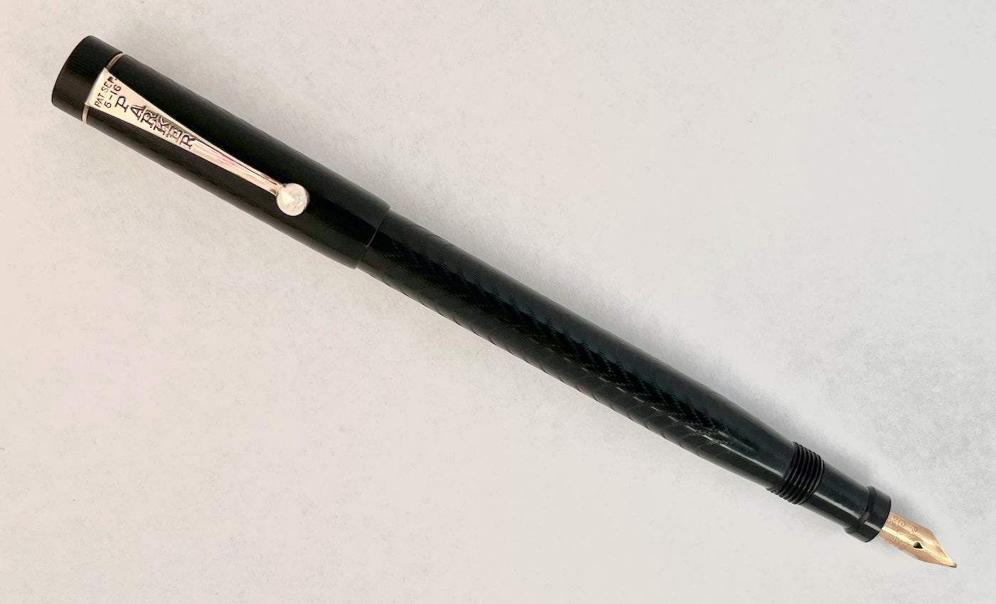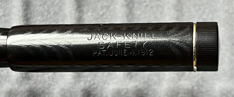 Details: Manufactured roughly 3 decades after the company was founded in 1888, this early Parker features a Safety cap (imprinted "Jack-Knife Safety" with a 1912 patent date) designed not to leak when carried ([DETAIL PHOTO](https://imgur.com/xvh8knh)). Early, protuberant barrel-threads indicate 1910s manufacture. It's made of chased black hard rubber with a nickel-plated clip. Some of these have a ‘2 1/2’ or ‘20 1/2’ stamped on the blindcap but, like many early variants, this one has no stamp.