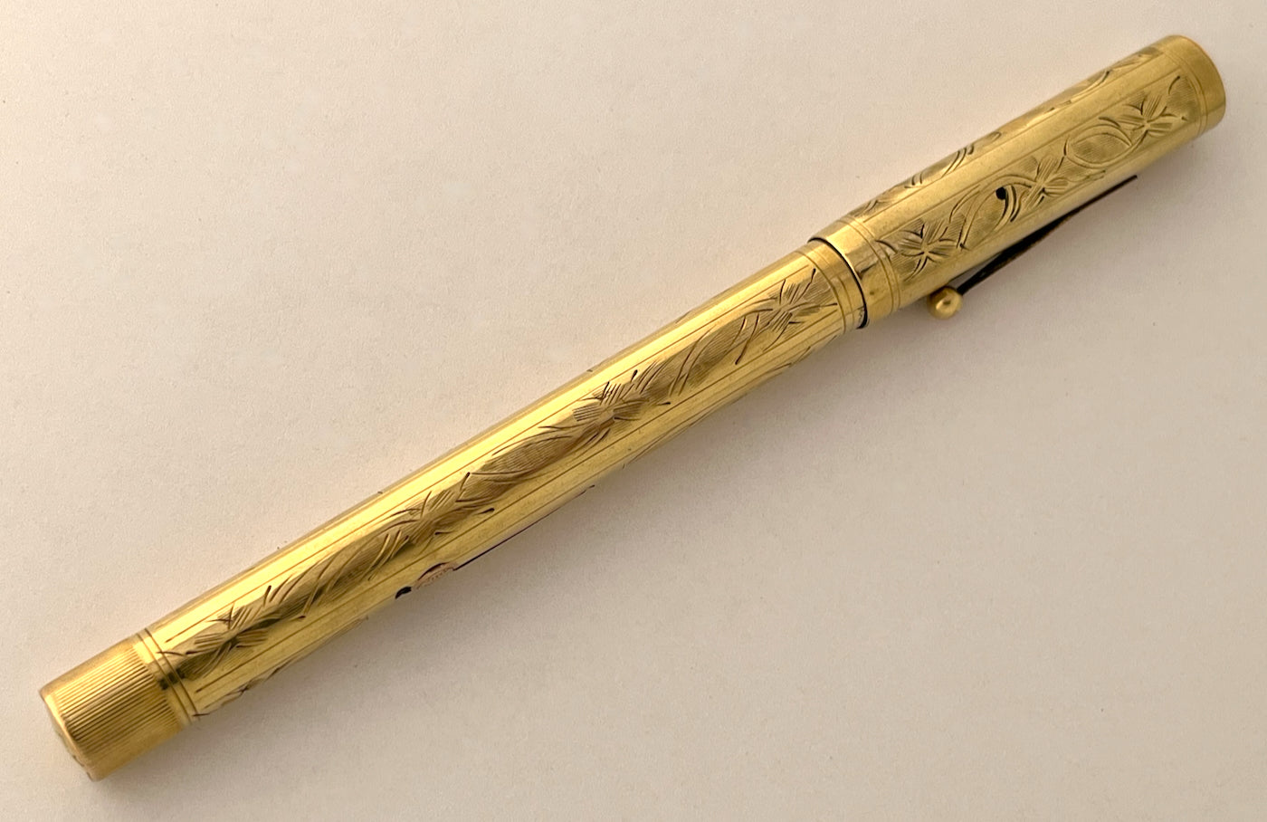 Details: This pen epitomizes how Waterman's overlays exhibit a level of craftsmanship and attention to detail that is all but unmatched by anything being made today. This gold-filled overlay pen features one of the maker’s most exquisite Art Deco motifs, an overlay pattern known as Pansy Panel. The design typically consists of panels of burgeoning with leaves, petals, and flowers, though this one is unusual for having only leaves and petals (I see none of the central disks among the petals that usually sets them apart as pansies). Unlike many of Watermans other overlays of the period, this LEC (Long End Covered) model has a barrel-end encapsulated by the overlay with a machine-knurled portion on the end, onto which with cap posts securely with a satisfying click. Clip and lever both stamped with Waterman’s iconic globe emblem.