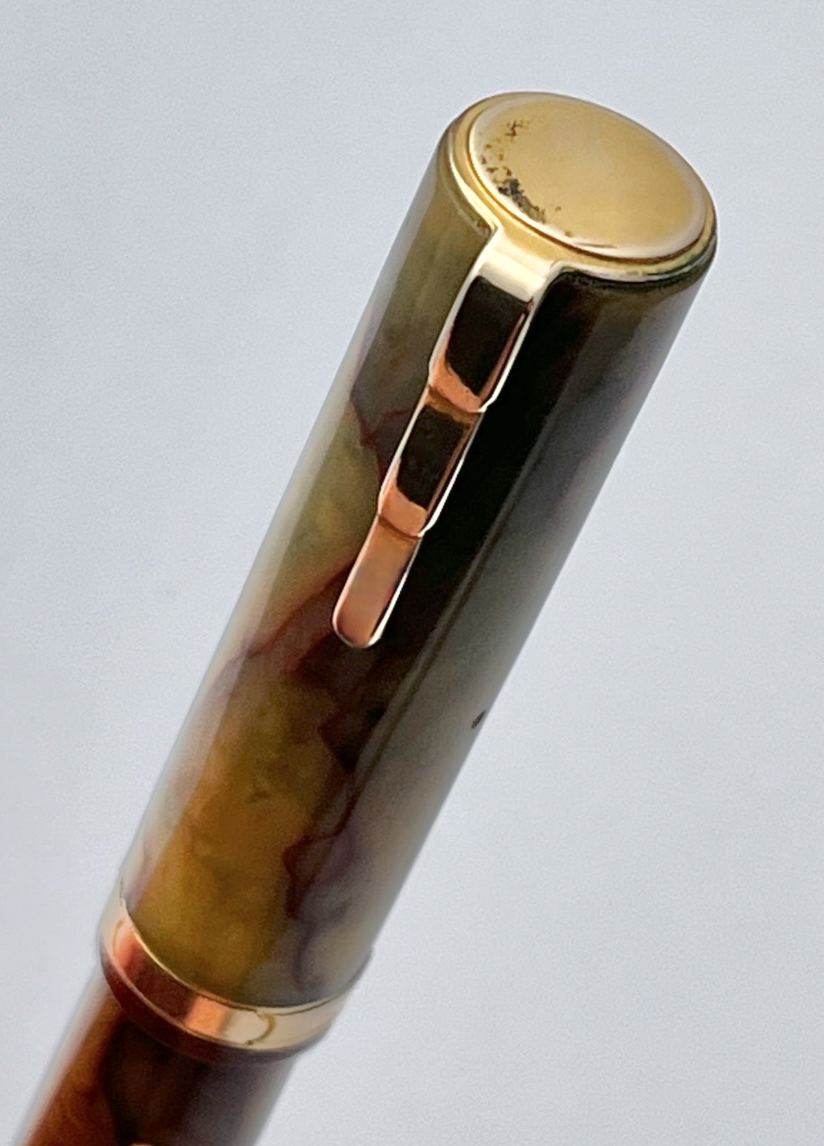 Condition: Moderate discoloration. Gold-plated trim is pristine with no brassing or other notable flaws aside from a sliver of plating-wear on the captop and center of the lever. Celluloid surface is smooth and lustrous with no deep scratches or other noteworthy flaws. Manufacturer imprint on barrel is factory deep and fully legible.
