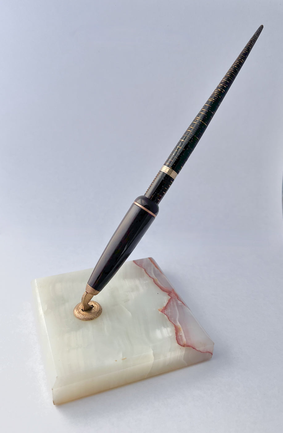 Details: The pen is a blue diamond model in Golden Pearl celluloid with chevron cap band from 1941 (date code with imprint on barrel). The base is made of solid marble with a trumpet in a dark mahogany pattern that’s made of a material I haven’t been able to identify (possibly Bakelite). Gold-plated accents including decorative ring on the trumpet and tilting mechanism attaching the trumpet to the base. Taper unscrews just like a blind cap and the pen is filled just like any other 3rd-gen Vac.